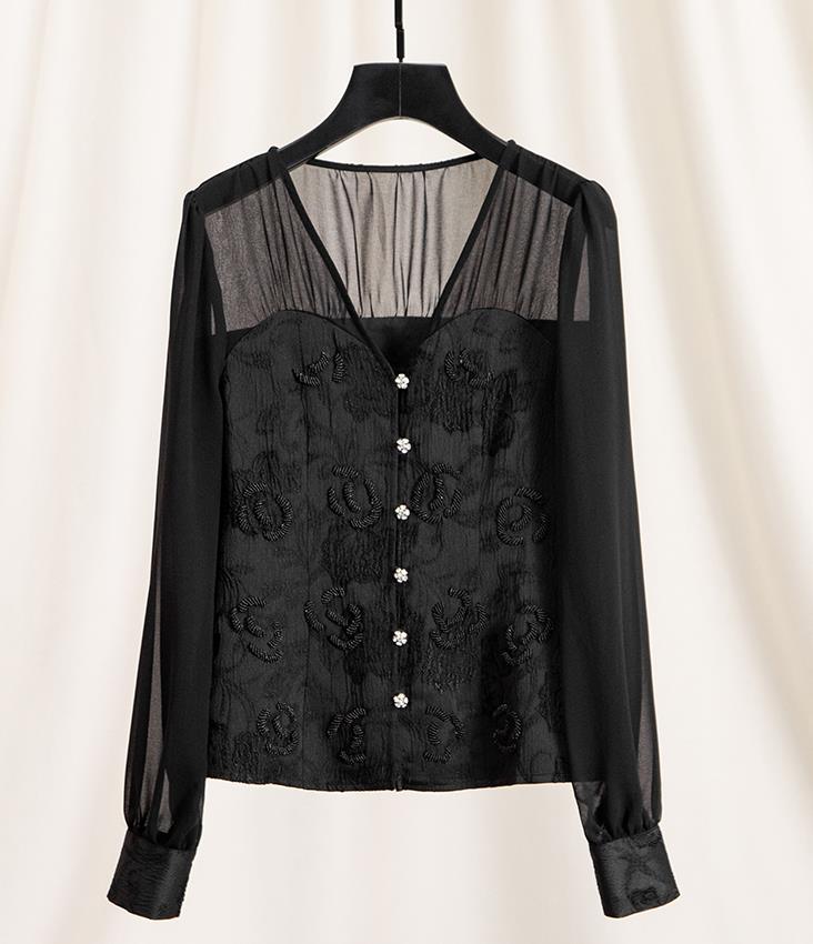 Bead Diamond Wrapped Chest V-neck Slightly Women Shirts Blouses And Tops Long Sleeve T Shirt For Women