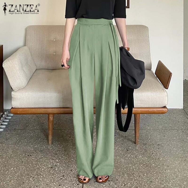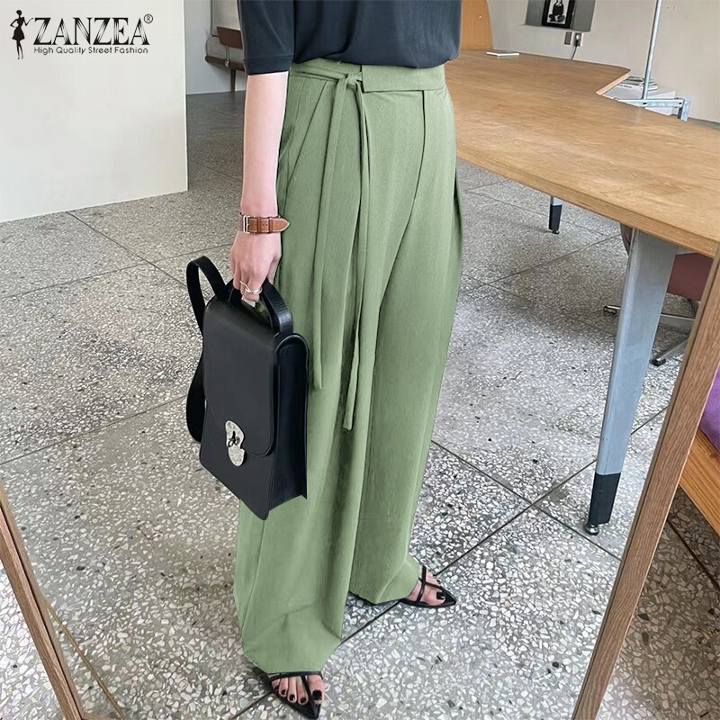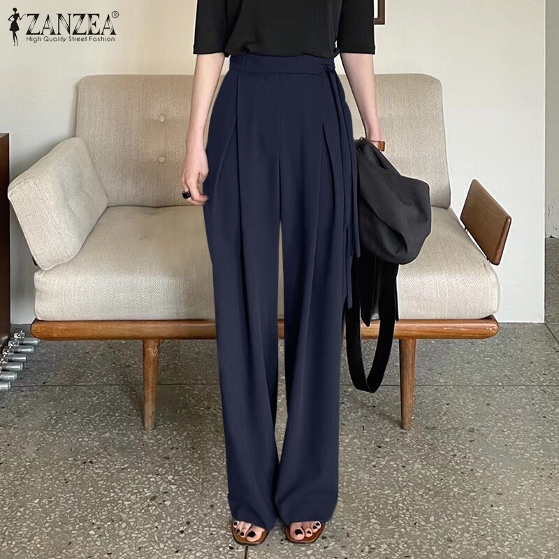 ZANZEA Korean Style Womens Button Lace-up High Waist Chic Trousers Wide Leg Pants Slacks