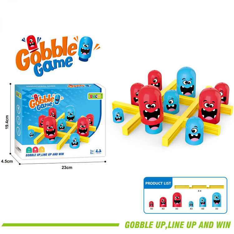 Just like in Tic-Tac-Toe, players have to line up 3 of their Gobblers in a row to win. But here’s the catch: you can gobble up your opponent’s smaller pieces to steal their spot!