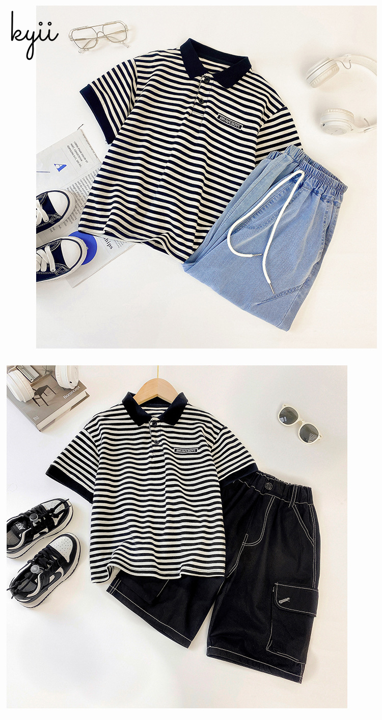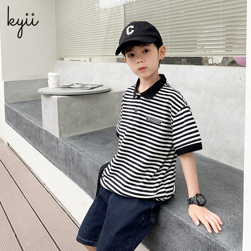 KYII stripe short sleeve Casual boys cotton summer loose shirt Korean Shirt kyb041
