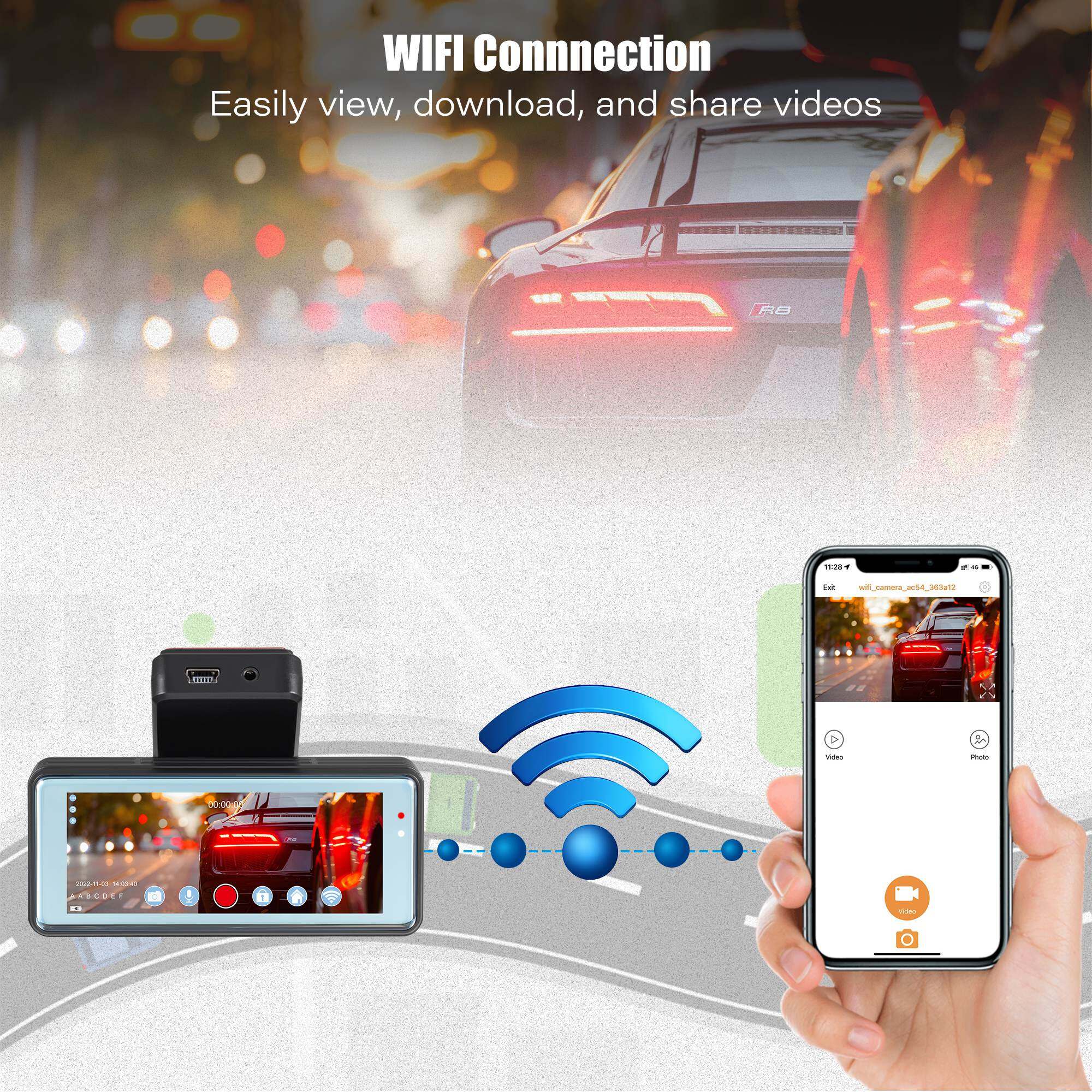 1. First install the recorder on the car, plug in the power supply, turn on the WIFI function of the recorder, and make the recorder enter the power-on recording state.